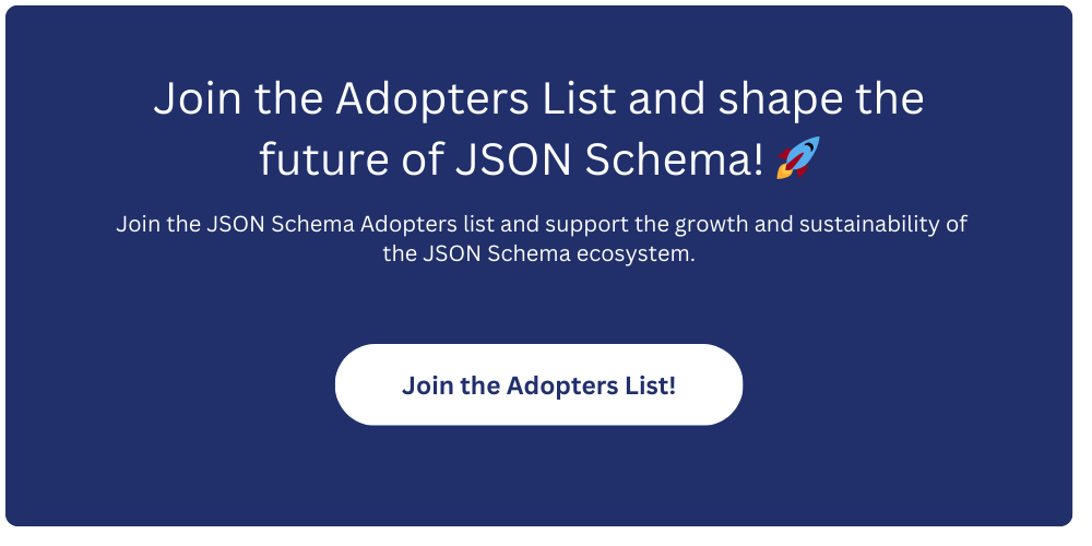 Data consistency and interoperability are critical for success in today's interconnected reality. While JSON is undoubtedly the most popular format for exchanging data, JSON Schema is essential for ensuring data consistency, validity, and interoperability at scale. Despite the widespread adoption of JSON Schema, there has yet to be a comprehensive list of adopters where individuals and organizations can seek inspiration and real-world use cases. This is why we are thrilled to announce the launch of the Adopters list.